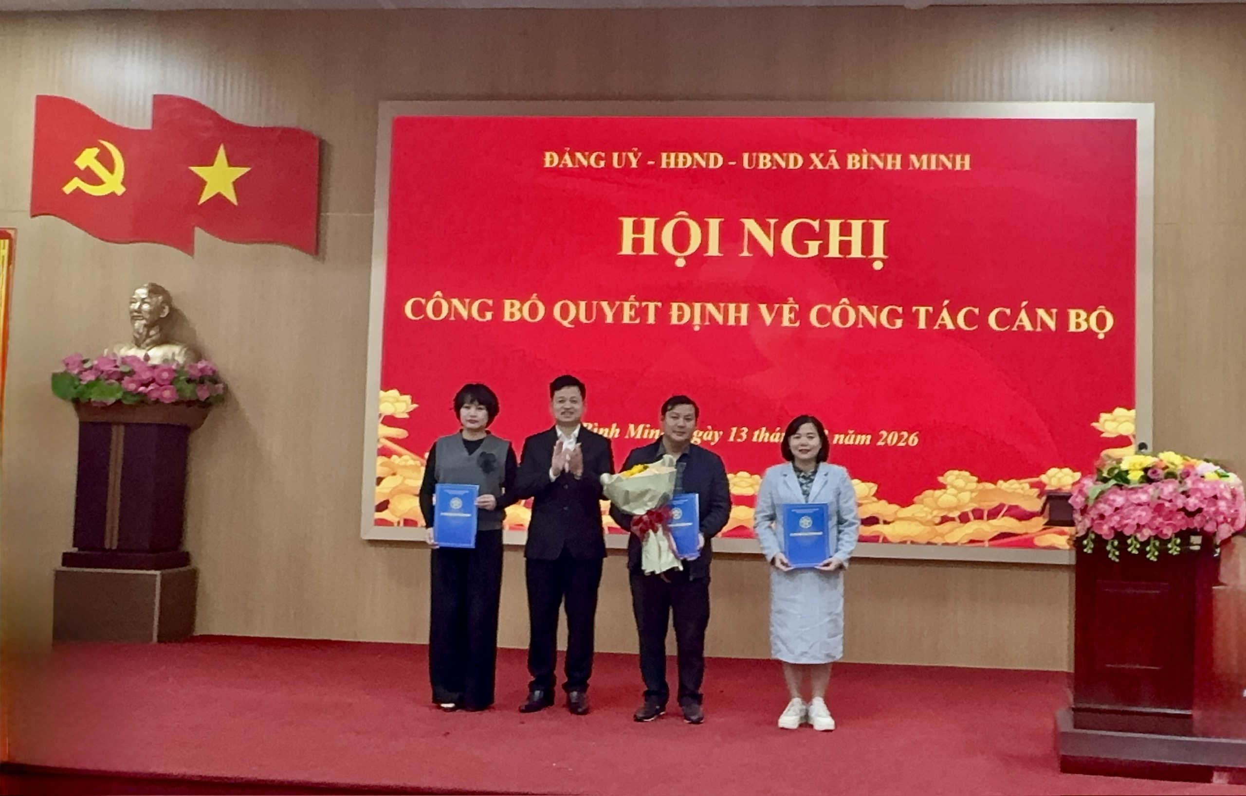 Thực hiện Quyết định của Chủ tịch Ủy ban nhân dân Thành phố Hà Nội về công tác cán bộ, sáng ngày 13/02/2026, Đảng ủy – Hội đồng nhân dân – Ủy ban nhân dân xã Bình Minh đã long trọng tổ chức Hội nghị công bố Quyết định phê chuẩn kết quả bầu chức vụ Phó Chủ tịch UBND xã Bình Minh, nhiệm kỳ 2021–2026 và công bố Quyết định kiện toàn Ban Giám đốc Trung tâm Dịch vụ Tổng hợp xã.