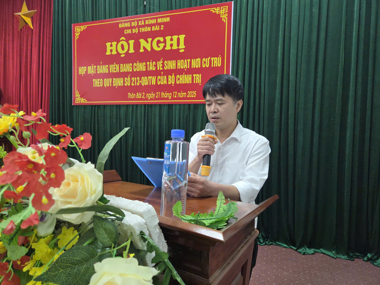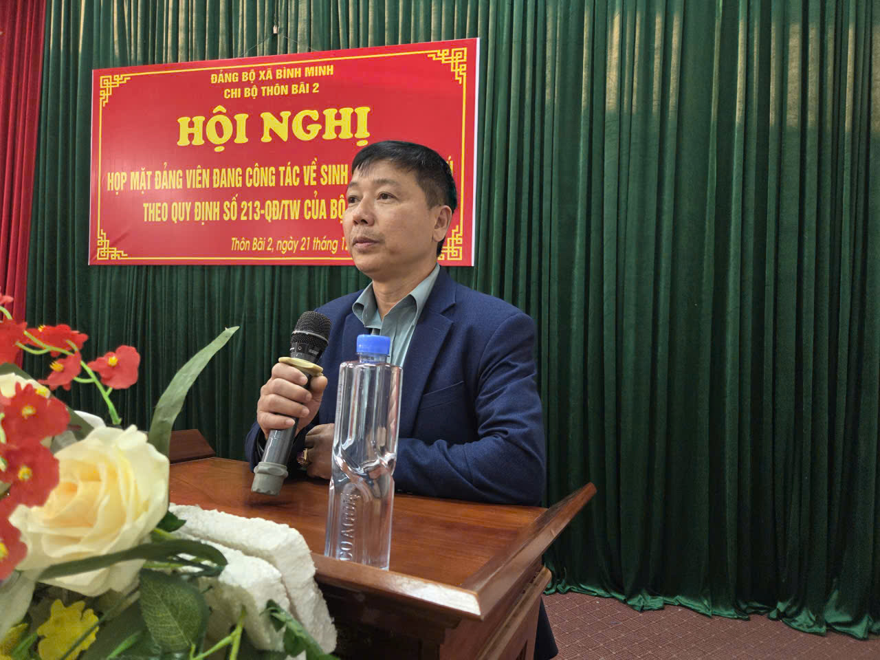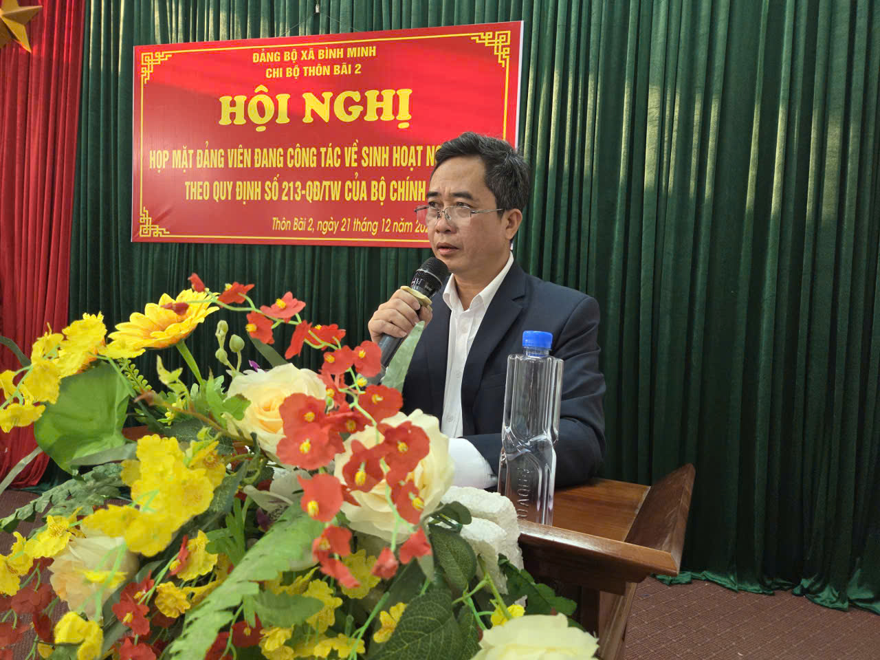 Phát biểu tại chương trình, đồng chí Nguyễn Trung Đài, UVBTV Đảng uỷ, Phó Chủ tịch HĐND xã đã ghi nhận tinh thần trách nhiệm, sự gắn bó của đội ngũ đảng viên đang công tác đối với địa phương; đồng thời thông tin tới đảng viên Chi bộ khái quát tình hình chung của xã từ ngày 01/7/2025 chính thức vận hành mô hình chính quyền địa phương 2 cấp. Tuy còn rất nhiều khó khăn, khối lượng công việc rất nhiều, song với cấp ủy, chính quyền và cả hệ thống chính trị của xã đã nỗ lực thực hiện tốt các nhiệm vụ chính trị của địa phương và đạt được nhiều kết quả phấn khởi. Trong thời gian tới đề nghị chi bộ thôn Bãi 2 tiếp tục phát huy tốt vai trò, trách nhiệm, tính tiền phong gương mẫu, huy động sức mạnh tổng hợp của cả hệ thống chính trị trong thực hiện các nhiệm vụ đề ra. Bám sát kế hoạch bầu cử của Hội đồng bầu cử Quốc gia để triển khai thực hiện công tác bầu cử Đại biểu Quốc hội khoá XVI và Đại biểu HĐND các cấp trên địa bàn. Mong rằng đảng viên trong chi bộ và đảng viên 213 phải là người gương mẫu chấp hành các quy định ở khu dân cư; tích cực thực hiện các nhiệm vụ chính trị tại cơ quan, đơn vị đang công tác và duy trì mối quan hệ với tổ chức Đảng và Nhân dân nơi cư trú. Tích cực hưởng ứng các cuộc vận động, phong trào thi đua yêu nước, góp phần cùng địa phương hoàn thành các chỉ tiêu, mục tiêu chính trị, kinh tế - xã hội, an ninh - quốc phòng. Khắc phục những biểu hiện sống xa dân, thiếu trách nhiệm trong các công việc của Nhân dân nơi cư trú, củng cố mối quan hệ mật thiết giữa Đảng với Nhân dân. Các đảng viên tiếp tục gương mẫu, tích cực tuyên truyền chủ trương của Đảng, chính sách pháp luật của Nhà nước; đồng hành cùng chi bộ và thôn trong xây dựng đời sống văn hóa, giữ gìn an ninh trật tự và thực hiện các nhiệm vụ chính trị tại cơ sở.