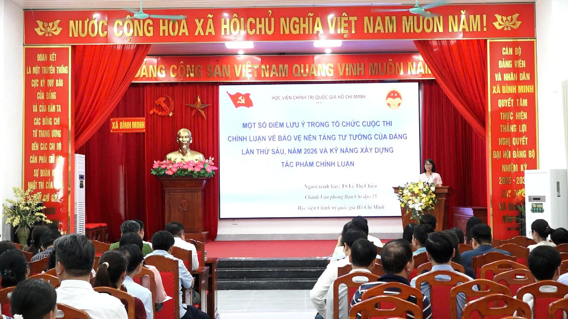 Tiến sĩ Lê Thị Chiên – Phó Vụ trưởng Vụ quản lý khoa học, Chánh Văn phòng Ban Chỉ đạo 35, Học viện Chính trị Quốc gia Hồ Chí Minh đã tập huấn, hướng dẫn cách viết bài tham dự Cuộc thi chính luận về bảo vệ nền tảng tư tưởng Đảng lần thứ Sáu, năm 2026 cho các đại biểu.
