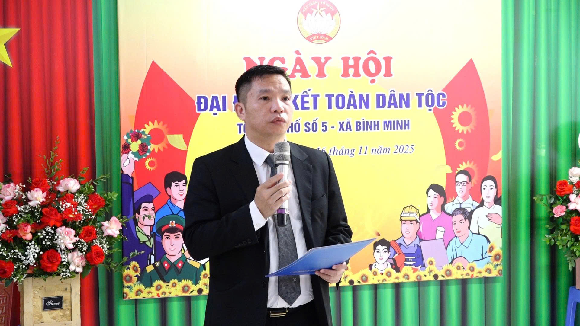 Sáng 16/11, Tổ dân phố số 5 xã Bình Minh đã long trọng tổ chức Ngày hội Đại đoàn kết toàn dân tộc. Kỷ niệm 95 năm ngày truyền thống Mặt trận Tổ quốc Việt Nam (18/11/1930 - 18/11/2025). Dự Ngày hội có đồng chí Vũ Mạnh Tuấn, UVBTV Đảng uỷ, Phó Chủ tịch UBND xã; lãnh đạo các phòng, ban, ngành, đoàn thể