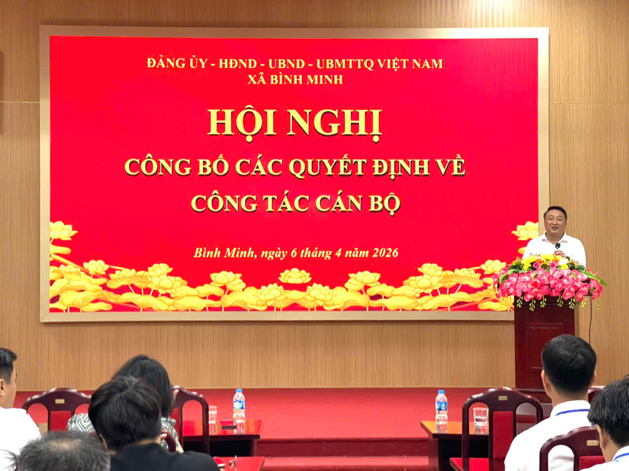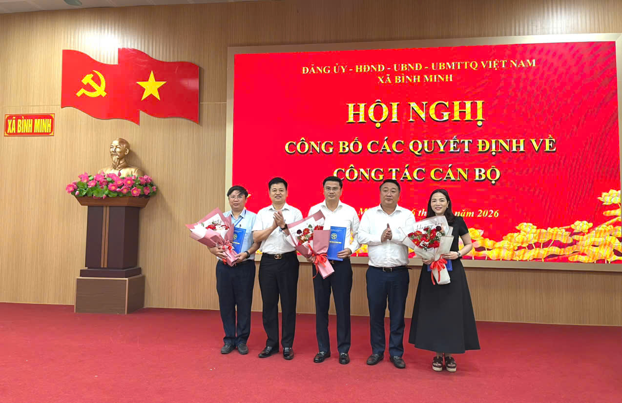 Tại hội nghị, Thường trực Đảng ủy xã Bình Minh đã công bố và trao Quyết định số 859/QĐ-UBND ngày 26/3/2026 của UBND xã về việc bổ nhiệm đồng chí Nguyễn Văn Biên, hiện là Phó Trưởng phòng Văn hóa - Xã hội xã Bình Minh, giữ chức vụ Trưởng phòng Văn hóa - Xã hội xã Bình Minh. Quyết định số 866/QĐ- UBND ngày 26/3/2026 của UBND xã về việc bổ nhiệm đồng chí Lê Hoàng Huy, chuyên viên Phòng Văn hoá xã hội giữ chức vụ Phó trưởng phòng Văn hoá xã hội xã Bình Minh. Quyết định số 868/QĐ-UBND ngày 26/3/2026 của UBND xã về việc bổ nhiệm đồng chí Nguyễn Thu Phương chuyên viên Phòng Văn hoá xã hội giữ chức vụ Phó trưởng phòng Văn hoá xã hội xã Bình Minh