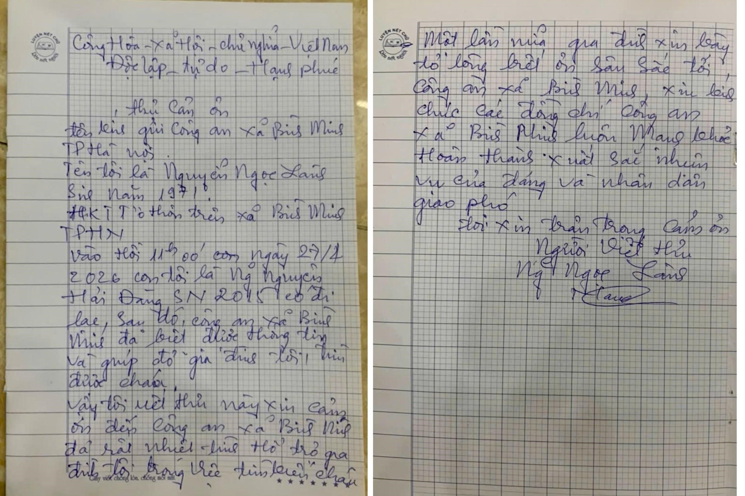 Xúc động trước sự tận tâm, trách nhiệm của lực lượng Công an xã, gia đình cháu bé đã gửi thư cảm ơn, bày tỏ lòng biết ơn sâu sắc đối với các đồng chí đã không quản thời gian, công sức, kịp thời giúp đỡ gia đình tìm lại người thân.