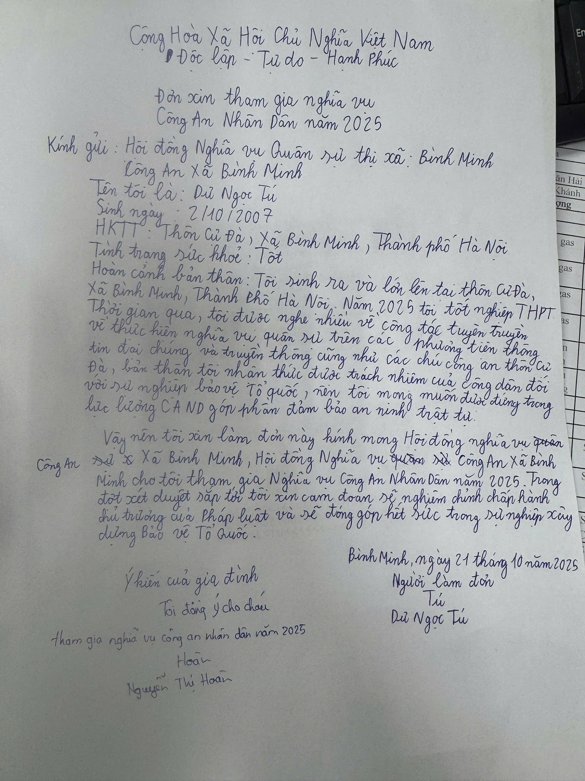 Tổ Cảnh sát khu vực Công an xã đã tiếp nhận đơn tình nguyện tham gia nghĩa vụ Công an nhân dân của công dân Dư Ngọc Tú, sinh năm 2007, trú tại thôn Cự Đà, xã Bình Minh. Tú là một thanh niên được sinh ra và lớn lên trên mảnh đất Bình Minh giàu truyền thống cách mạng, nơi hun đúc tinh thần yêu nước, ý chí kiên cường và lòng nhân ái của bao thế hệ. Từ thuở nhỏ, Tú đã nuôi dưỡng ước mơ được khoác lên mình màu áo xanh Công an nhân dân, màu áo của lòng dũng cảm, của niềm tin và tinh thần “Vì Nhân dân phục vụ”. Sớm nhận thức được ý nghĩa thiêng liêng của việc tham gia nghĩa vụ trong lực lượng vũ trang, góp phần giữ gìn cuộc sống bình yên, bảo vệ Tổ quốc và Nhân dân - em đã tự nguyện viết đơn, bày tỏ mong muốn được rèn luyện, trưởng thành trong môi trường kỷ luật, trách nhiệm và đầy tự hào của lực lượng Công an nhân dân.