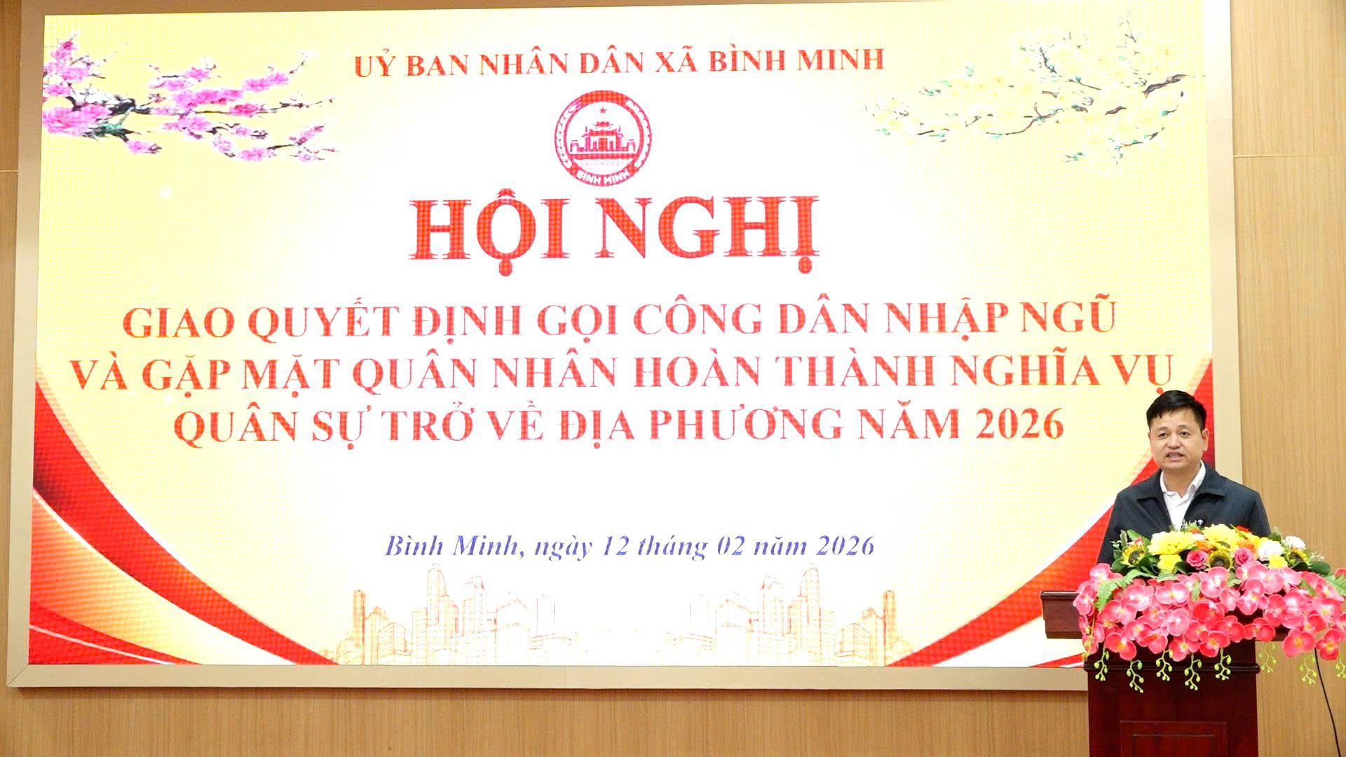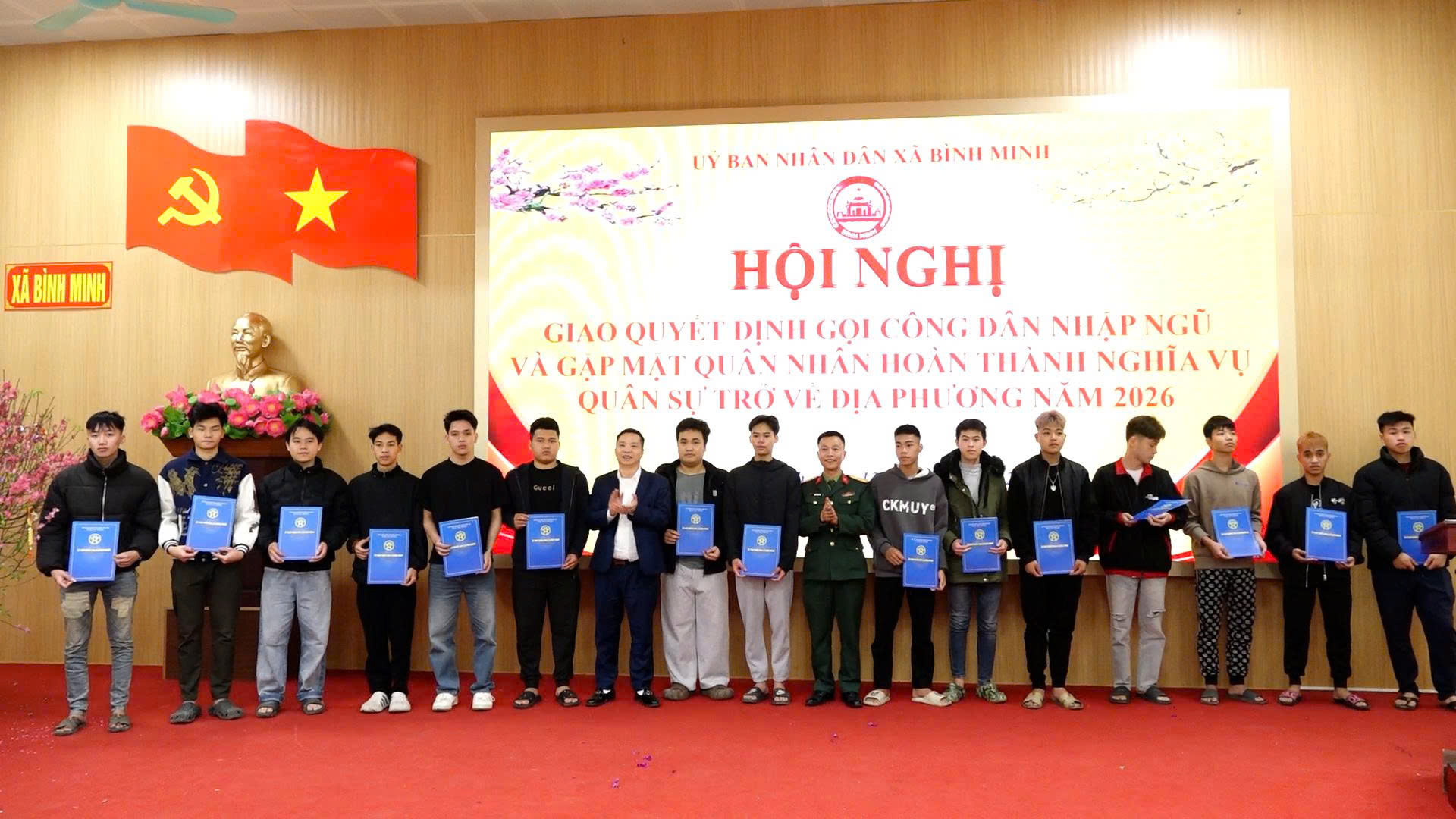 Chiều ngày 12-2, xã Bình Minh tổ chức Hội nghị giao quyết định gọi công dân nhập ngũ, quyết định gọi công dân thực hiện nghĩa vụ Công an nhân dân năm 2026, gặp mặt động viên quân nhân xuất ngũ năm 2026. Về dự có đồng chí Nguyễn Khánh Bình, Bí thư Đảng uỷ, Chủ tịch HĐND xã; đồng chí Lê Văn Ân, Phó Bí thư thường trực Đảng uỷ xã; đồng chí Nguyễn Đăng Việt, Phó Bí thư, Chủ tịch UBND, Chủ tịch hội đồng nghĩa vụ quân sự xã; các đồng chí Thường trực HĐND, Lãnh đạo UBND, Thường trực UBMTTQ, Trưởng các phòng, ban, ngành, đoàn thể xã; Bí thư chi bộ; Trưởng thôn, Tổ trưởng tổ dân phố, thôn đội trưởng, tổ đội trưởng, các công dân nhận lệnh gọi nhập ngũ năm 2026