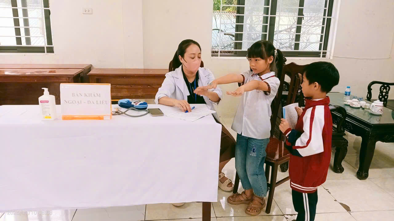 Đợt khám bao gồm các nội dung khám tổng quát và chuyên khoa: nội, ngoại, tai–mũi–họng, răng–hàm–mặt, mắt, cân đo chiều cao – cân nặng, đánh giá tình trạng dinh dưỡng, đồng thời sàng lọc sớm các bệnh lý học đường thường gặp như cận thị, cong vẹo cột sống, sâu răng, viêm amidan, béo phì hoặc suy dinh dưỡng. Toàn bộ quy trình được thực hiện theo đúng hướng dẫn chuyên môn của Sở Y tế và Trung tâm Y tế huyện Thanh Oai, đảm bảo an toàn, nhanh gọn, hiệu quả. Bà Đào Thị Thu Hường, Phó Trưởng trạm Y tế trực tiếp có mặt tại điểm khám để kiểm tra, giám sát và chỉ đạo chuyên môn, bảo đảm công tác khám diễn ra khoa học, chính xác, tuân thủ nghiêm quy trình nghiệp vụ và quy định về phòng chống lây nhiễm.