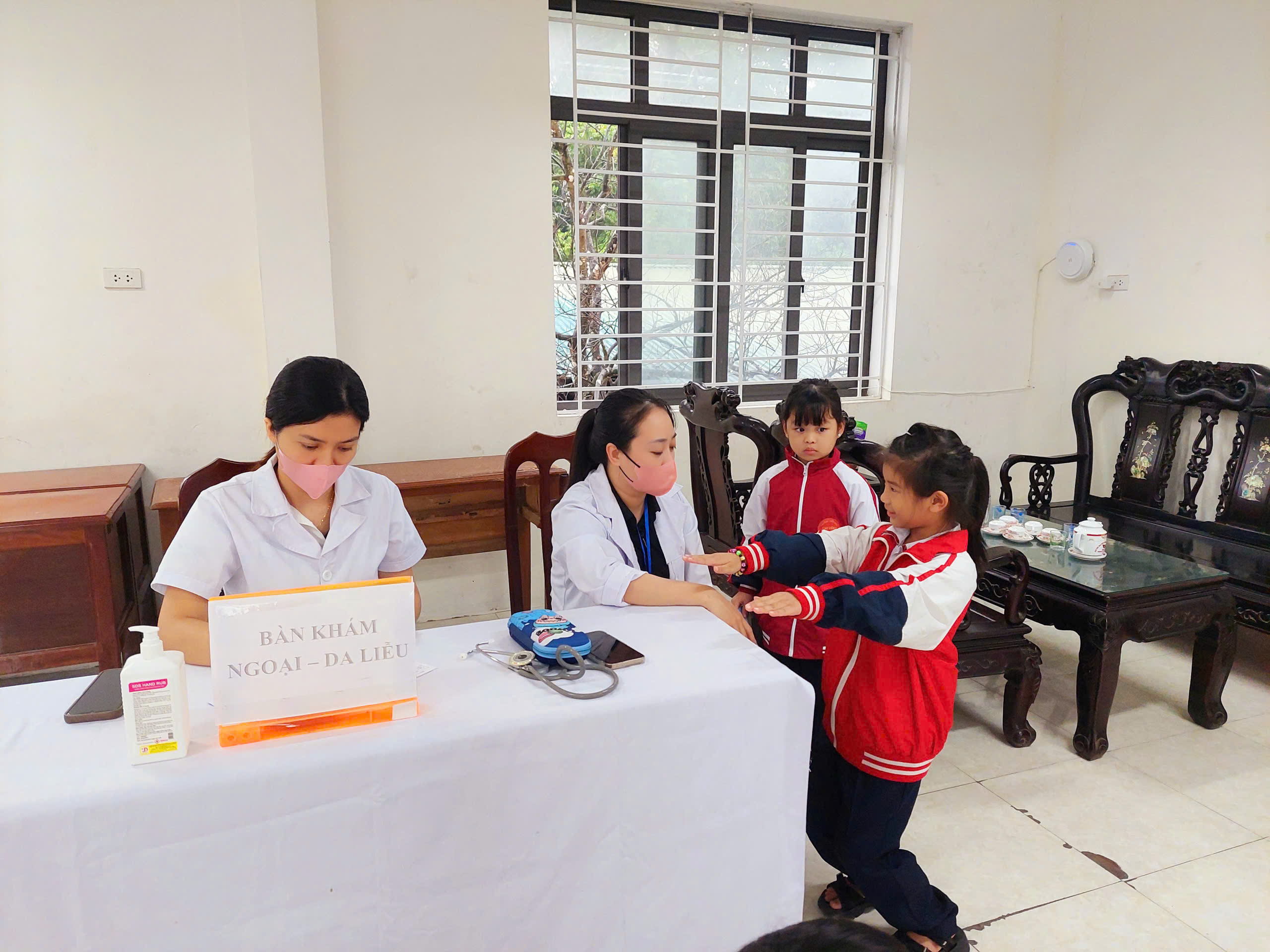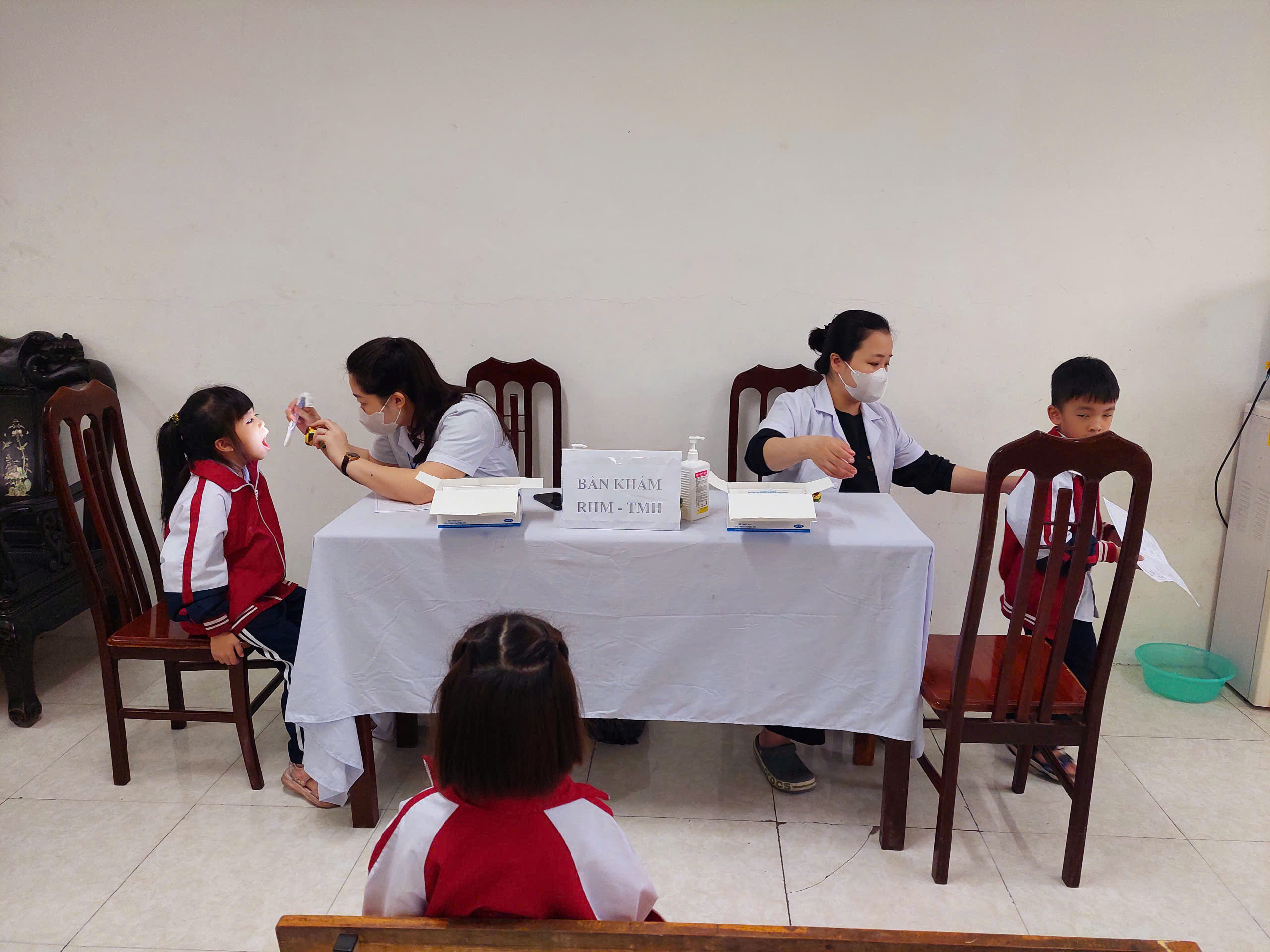 Ảnh: Các em học sinh chờ tới lượt khám SK