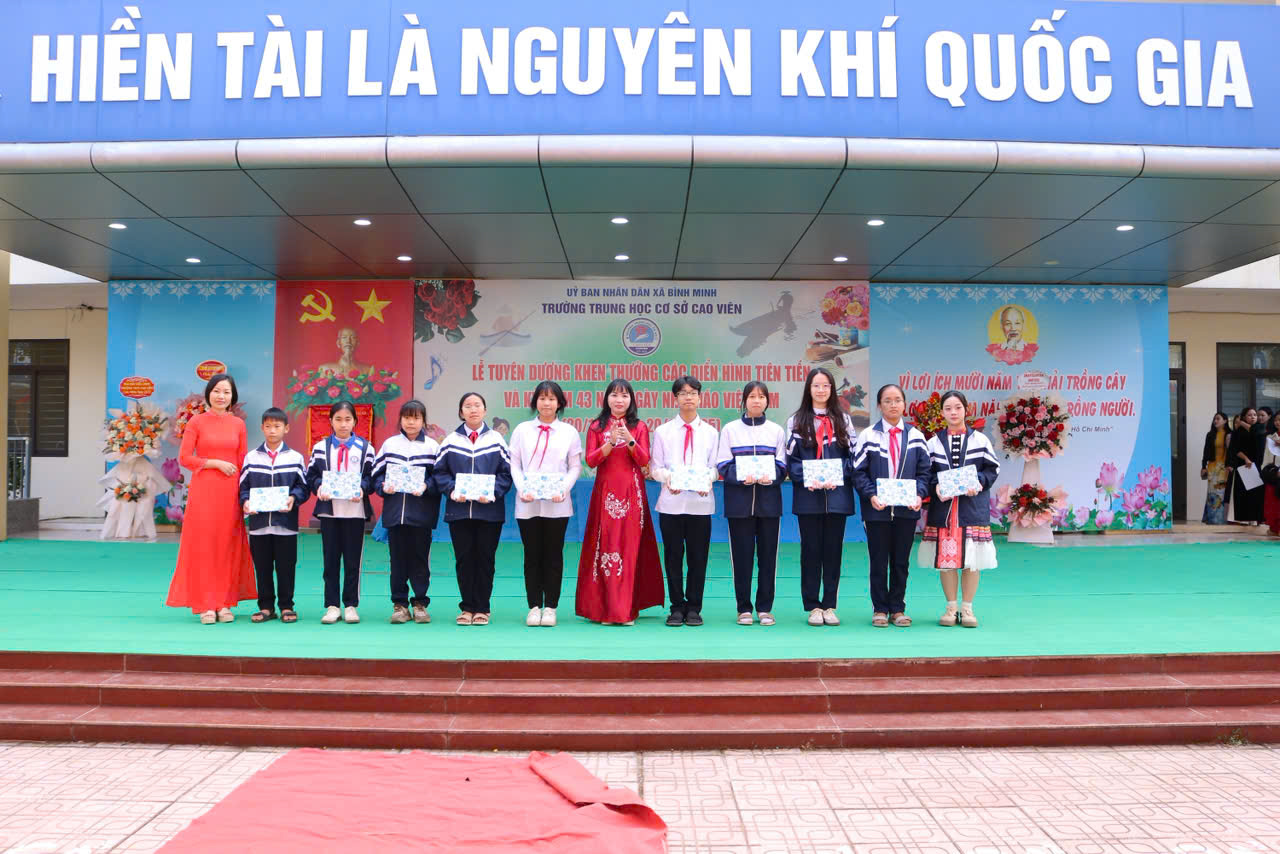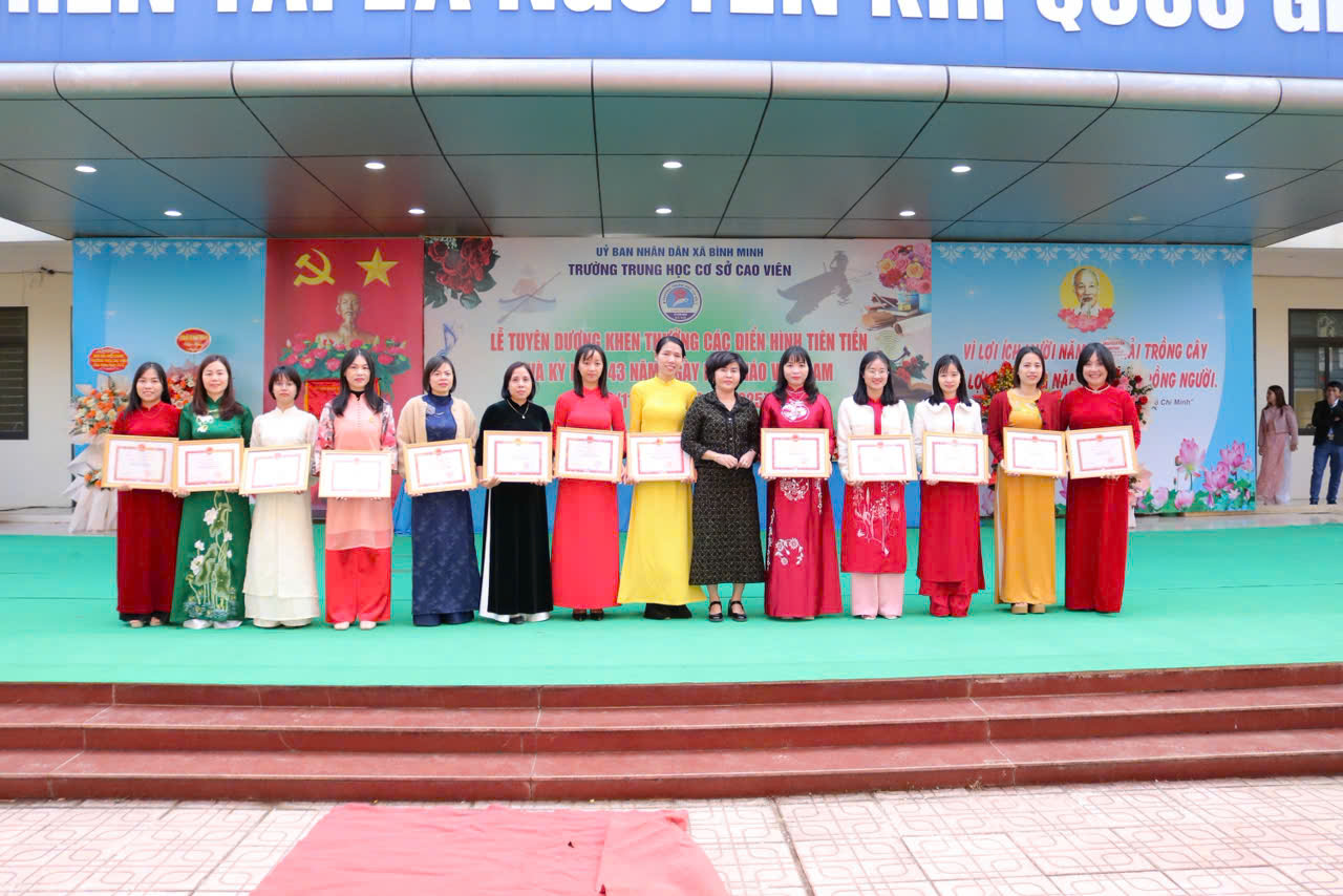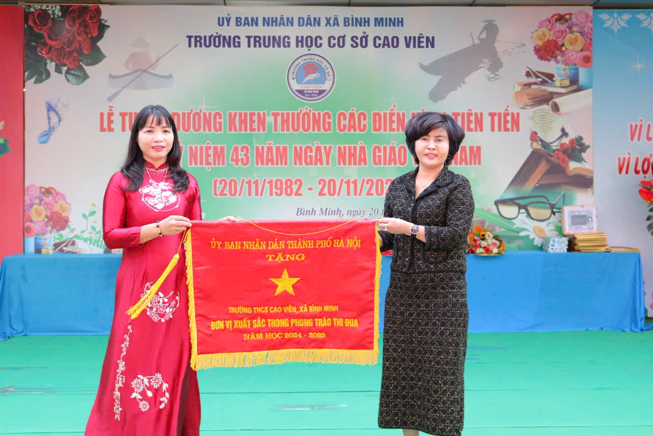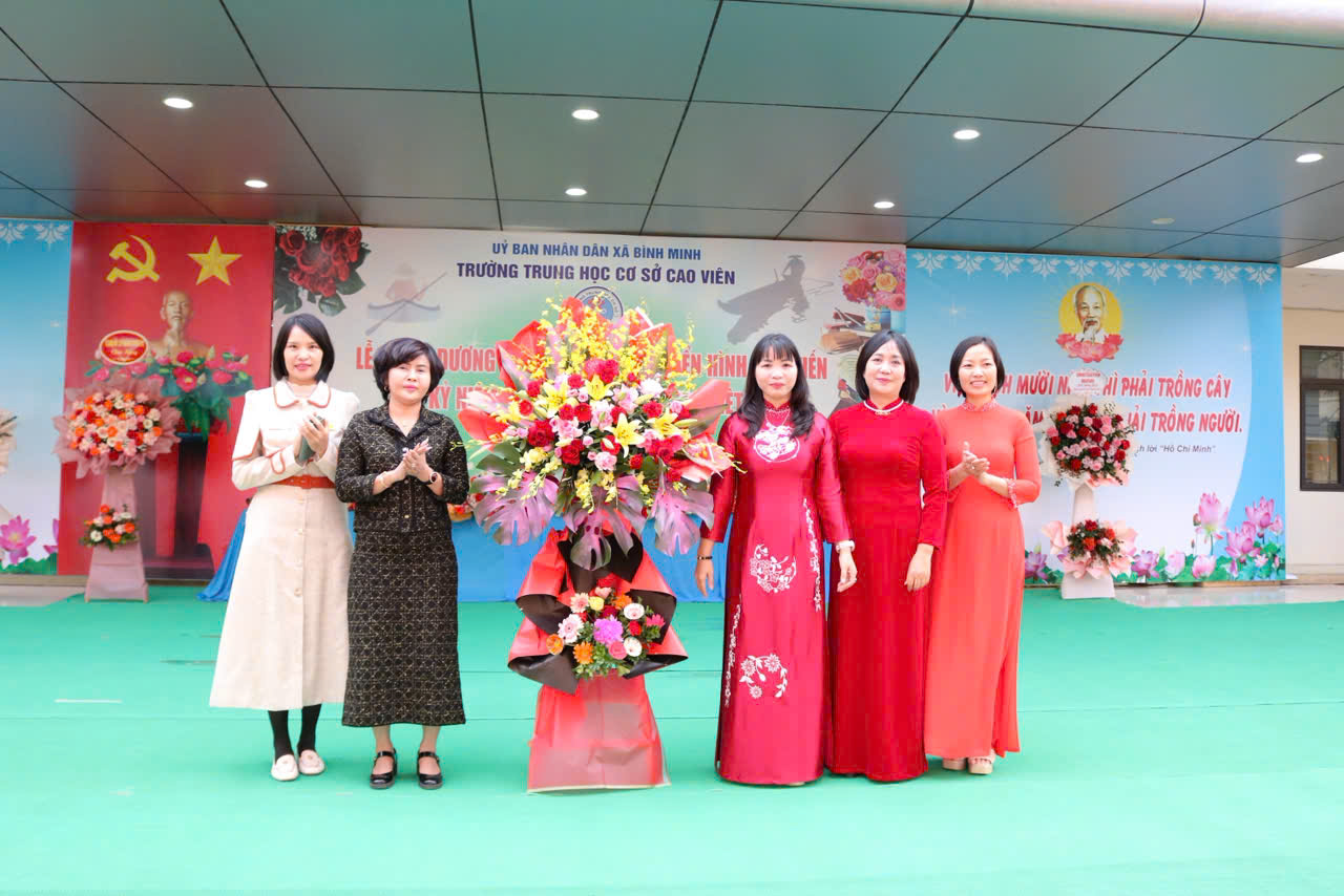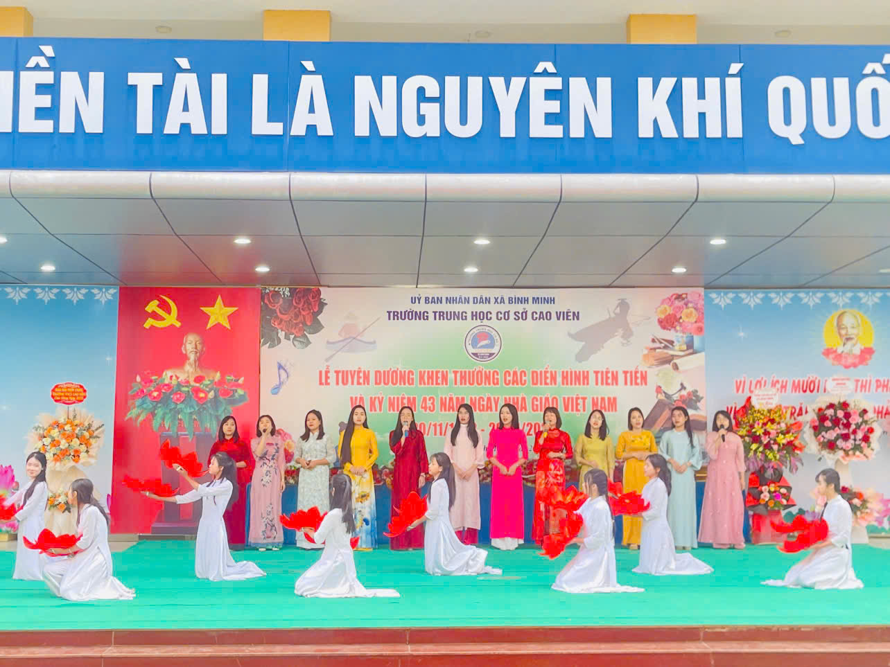 Sáng 20/11, Trường THCS Cao Viên long trọng tổ chức lễ kỷ niệm 43 năm Ngày Nhà giáo Việt Nam (20/11/1982 – 20/11/2025) và tuyên dương các tập thể, cá nhân có thành tích xuất sắc trong năm học 2024–2025. Buổi lễ vinh dự đón các đồng chí nguyên lãnh đạo nhà trường qua các thời kỳ; đại diện Ban cha mẹ học sinh; đặc biệt là sự hiện diện của đồng chí Nguyễn Thị Anh Đào – Đảng ủy viên, Trưởng Phòng Văn hóa - Xã hội xã Bình Minh, cùng toàn thể cán bộ, giáo viên, nhân viên và học sinh.
