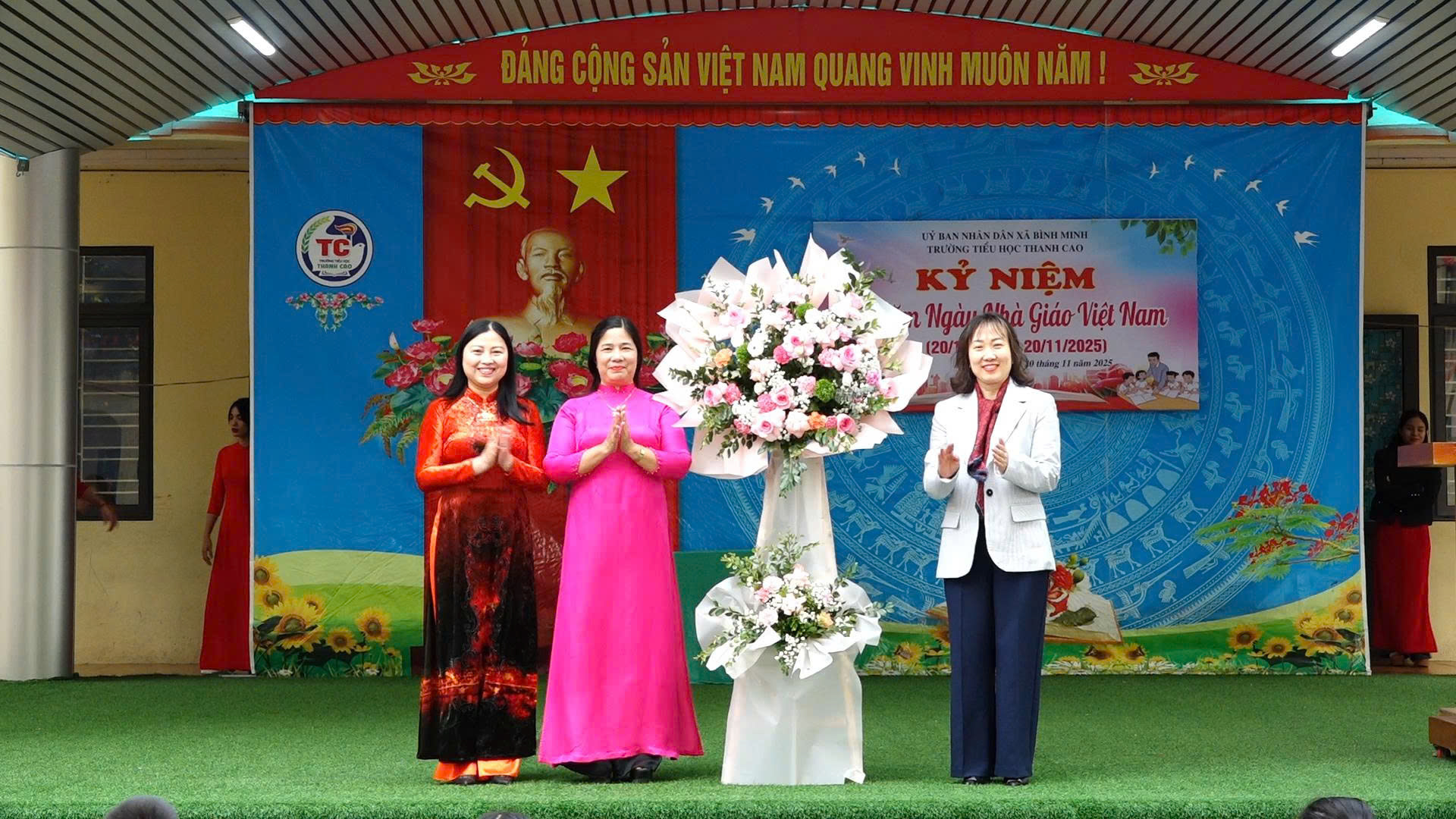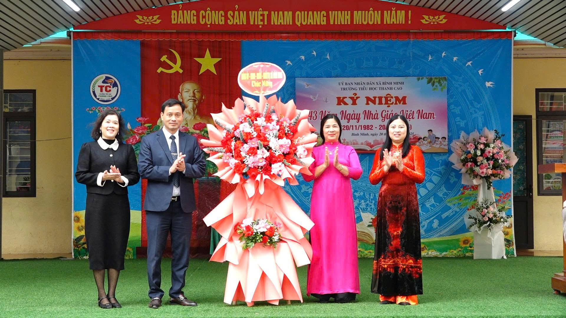 Lãnh đạo xã Bình Minh tặng hoa chúc mừng Trường TH Thanh Cao tại buổi lễ.
