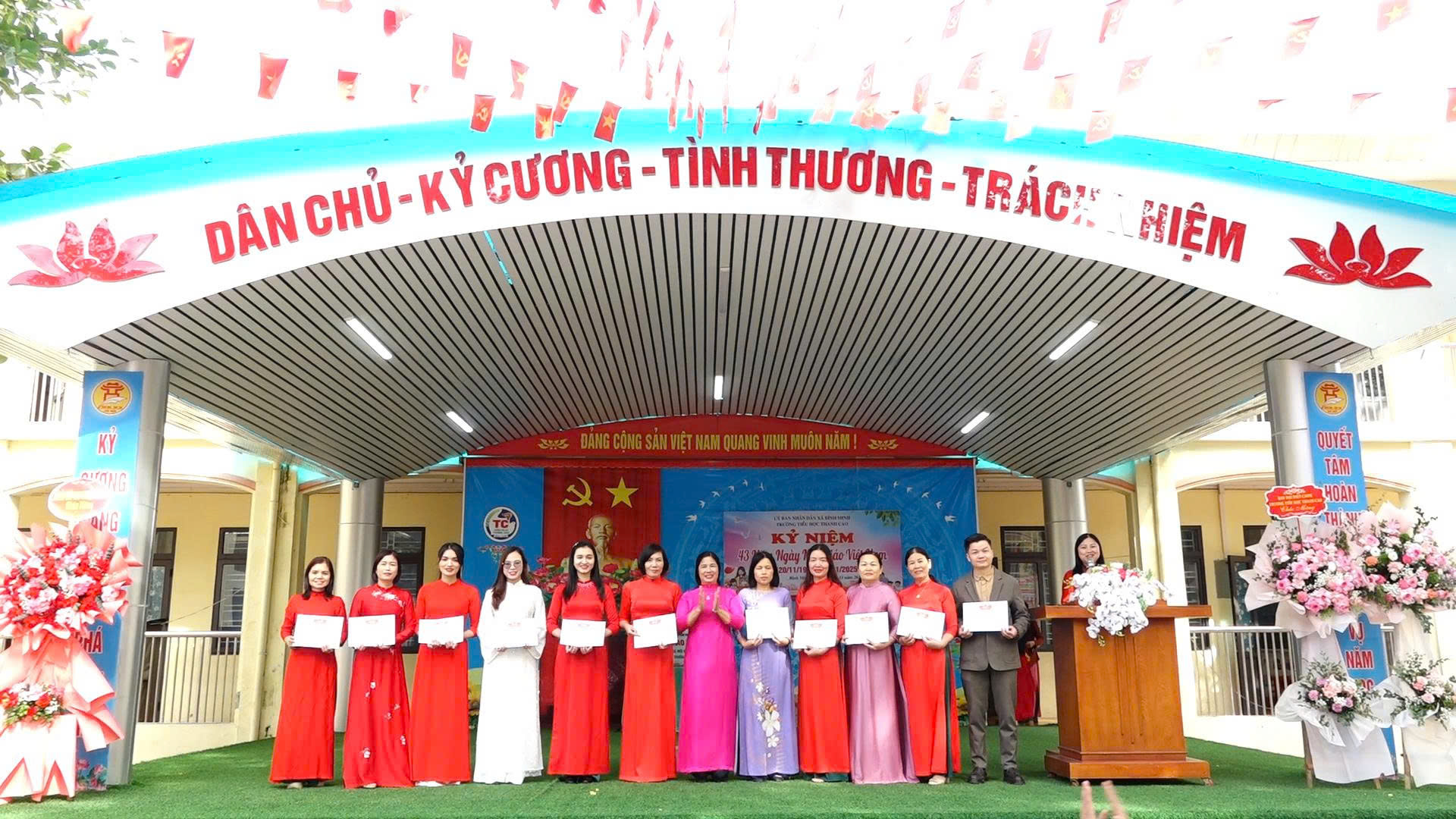 Tại buổi lễ, cô Nguyễn Thị Mai, Hiệu trưởng nhà trường đã ôn lại truyền thống tốt đẹp, tôn sư trọng đạo của dân tộc ta từ bao đời nay, đồng thời cũng gửi lời tri ân sâu sắc nhất tới các thế hệ cán bộ, giáo viên, nhân viên đã và đang gắn bó với nhà trường. Họ chính là những người đã cống hiến tâm sức, trí tuệ cùng nhà trường vượt qua muôn vàn khó khăn, đã dành trọn vẹn yêu thương và trách nhiệm giúp học sinh phát huy tối đa năng lực của mình. Chính sự cống hiến của các cán bộ, giáo viên, nhân viên đã làm nên những thành tích đáng ghi nhận.