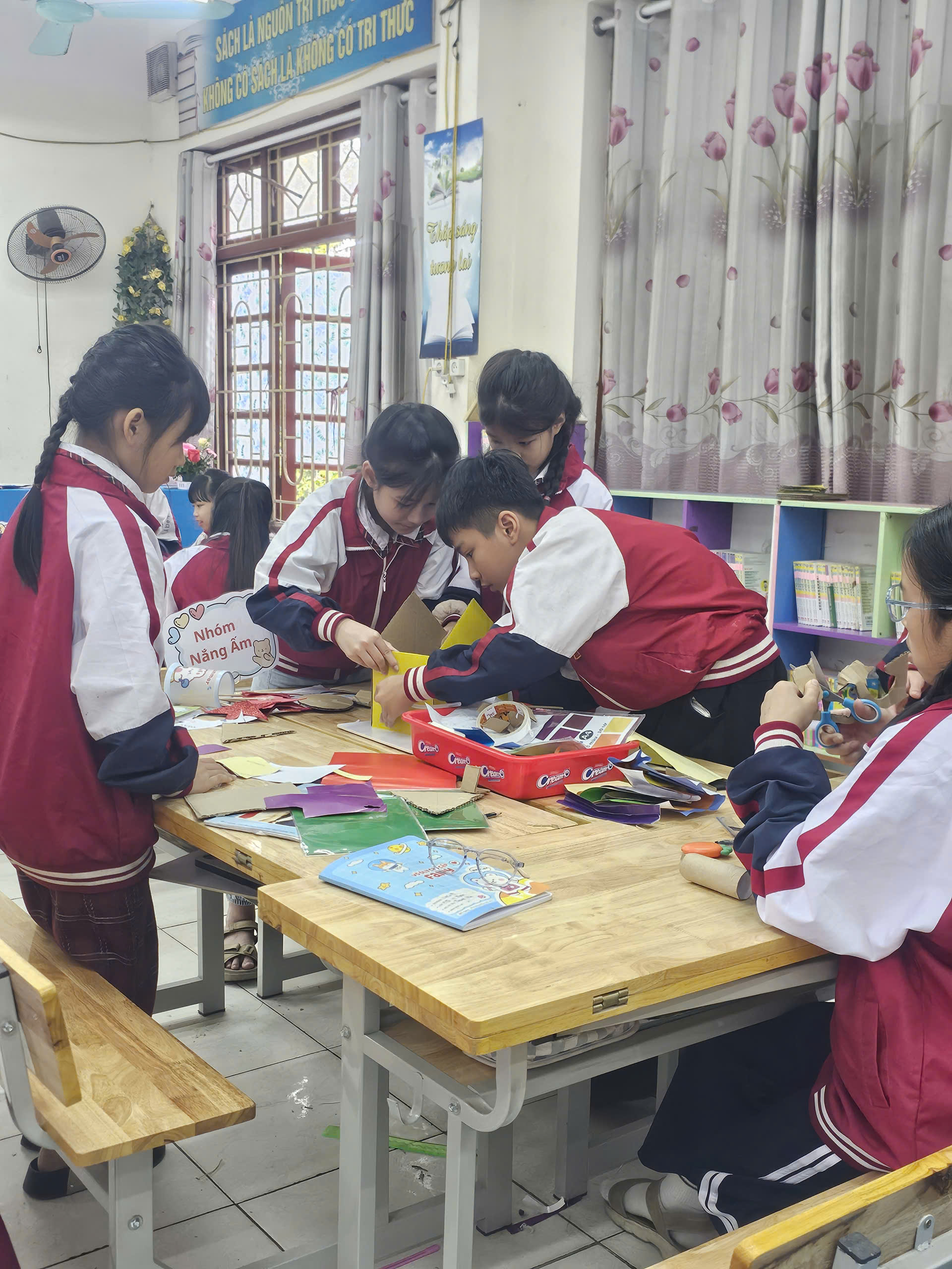 Trong phần trọng tâm của bài học thiết kế và chế tạo mô hình, học sinh làm việc theo nhóm 6, đóng vai "kiến trúc sư nhí" để phân tích yêu cầu, đề xuất giải pháp, vẽ bản thiết kế, đo - vẽ - tính toán kích thước, lựa chọn vật liệu phù hợp (giấy, bìa, ống hút, que kem…), lắp ghép và hoàn thiện mô hình "Ngôi nhà kiên cố".