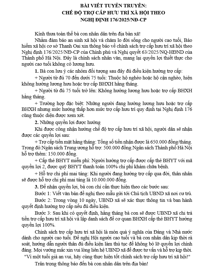 img > plus-circle Created with Sketch Beta. Aa BÀI TUYÊN TRUYỀN VỀ CHẾ ĐỘ TRỢ CẤP HƯU TRÍ XÃ HỘI THEO NGHỊ ĐỊNH 176/2025/NĐ-CP 15:42 13/04/2026 - BẢO HIỂM XÃ HỘI CƠ SỞ THANH OAI TRÂN TRỌNG THÔNG BÁO TỚI BÀ CON NHÂN DÂN TRÊN ĐỊA BÀN XÃ BÌNH MINH!