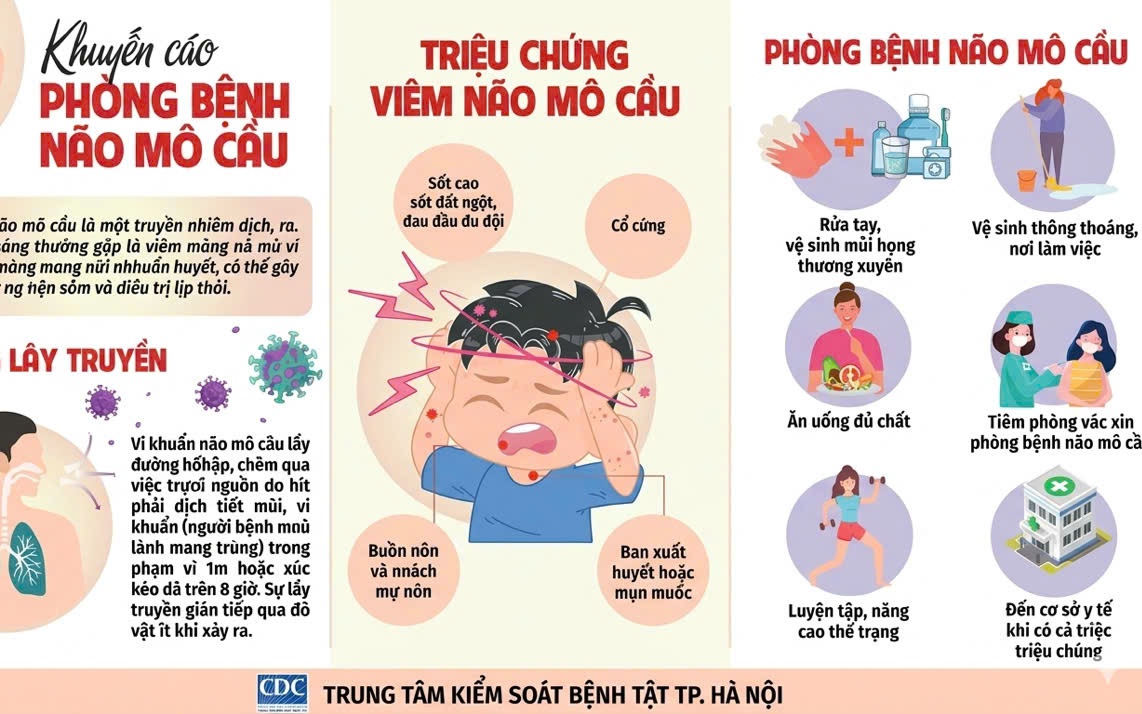 Bệnh não mô cầu là bệnh truyền nhiễm nguy hiểm, có khả năng lây lan nhanh qua đường hô hấp và có thể gây tử vong nếu không được phát hiện, điều trị kịp thời. Để chủ động phòng, chống bệnh, bảo vệ sức khỏe cho bản thân, gia đình và cộng đồng, ngành Y tế khuyến cáo người dân thực hiện tốt các biện pháp sau: