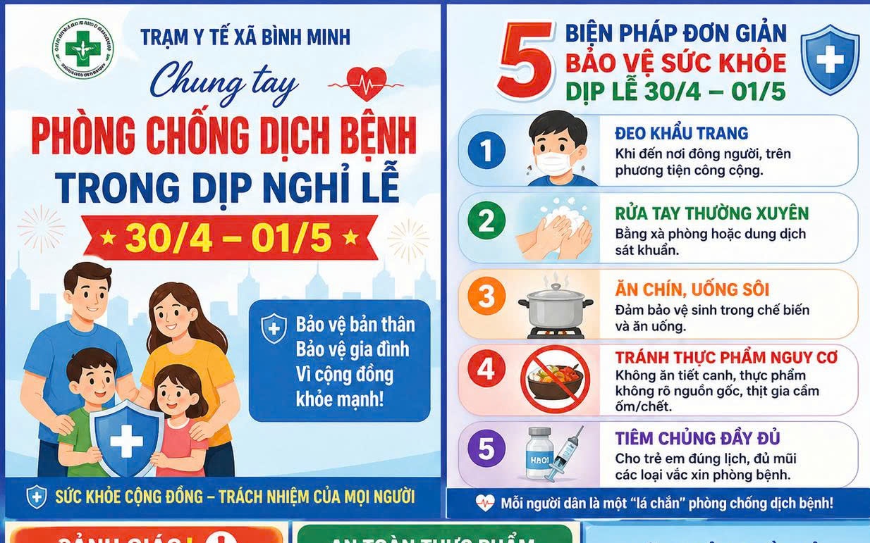 Nhằm đảm bảo sức khỏe cho Nhân dân trong dịp nghỉ lễ, Trạm Y tế xã Bình Minh khuyến cáo mỗi người dân hãy nâng cao ý thức phòng chống dịch bệnh với các nội dung sau:
