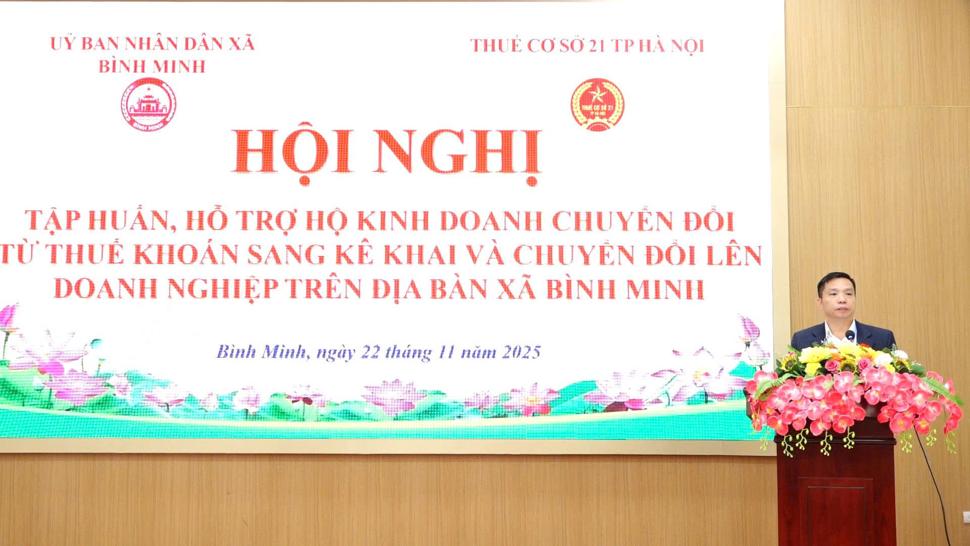 Sáng ngày 22/11/2025, Thuế cơ sở 21 thành phố Hà Nội phối hợp với UBND xã Bình Minh tổ chức hội nghị tuyên truyền, hỗ trợ hộ kinh doanh chuyển đổi từ thuế khoán sang kê khai và chuyển đổi lên doanh nghiệp đối các hộ kinh doanh trên địa bàn xã.