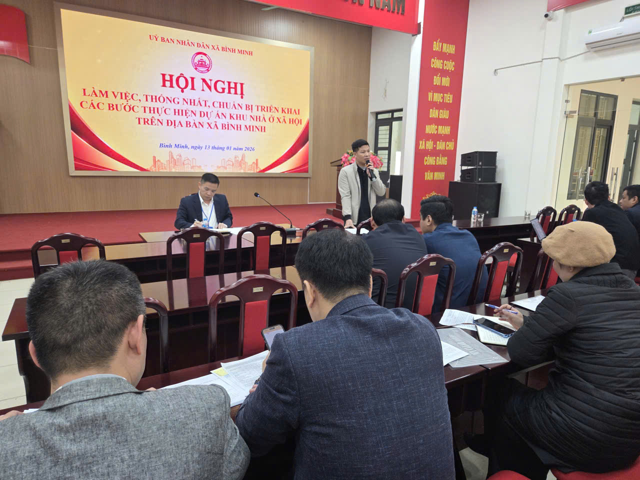 Phát biểu tại buổi làm việc, đồng chí Vũ Mạnh Tuấn, UVBTV Đảng uỷ, Phó Chủ tịch UBND xã nhấn mạnh: "Việc triển khai các dự án nhà ở xã hội trên địa bàn xã Bình Minh là chủ trương đúng đắn, có ý nghĩa rất quan trọng trong việc đáp ứng nhu cầu nhà ở cho người dân, đặc biệt là các đối tượng có thu nhập thấp. UBND xã sẽ phối hợp chặt chẽ với các chủ đầu tư và các cơ quan chức năng, bảo đảm quá trình triển khai đúng quy định của pháp luật, công khai, minh bạch và hạn chế thấp nhất ảnh hưởng đến đời sống sinh hoạt của Nhân dân."