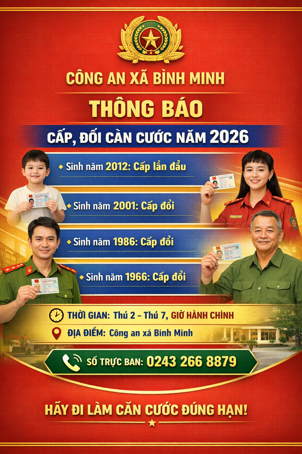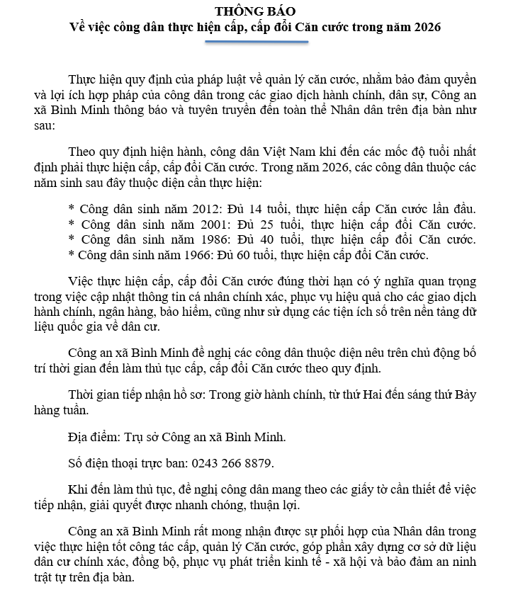 img > plus-circle Created with Sketch Beta. Aa THÔNG BÁO Về việc công dân thực hiện cấp, cấp đổi Căn cước trong năm 2026 Công an xã 13:51 29/03/2026 - CÔNG AN XÃ -
